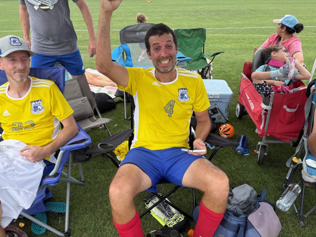 Santos came out hungry for the second half, desperately trying to get back into the game so that they could finish the season ahead of the Cameron Road, but the defense was standing firm. Guillermo was doing his usual leading from the center. Chris G was running down (and into) attackers with general disregard for anything except launching the ball to safety. Jeff Z and Brian Parks stood their ground in the face of Santos attacks. And Jefe was in the mix providing valuable minutes in this five man defensive rotation.