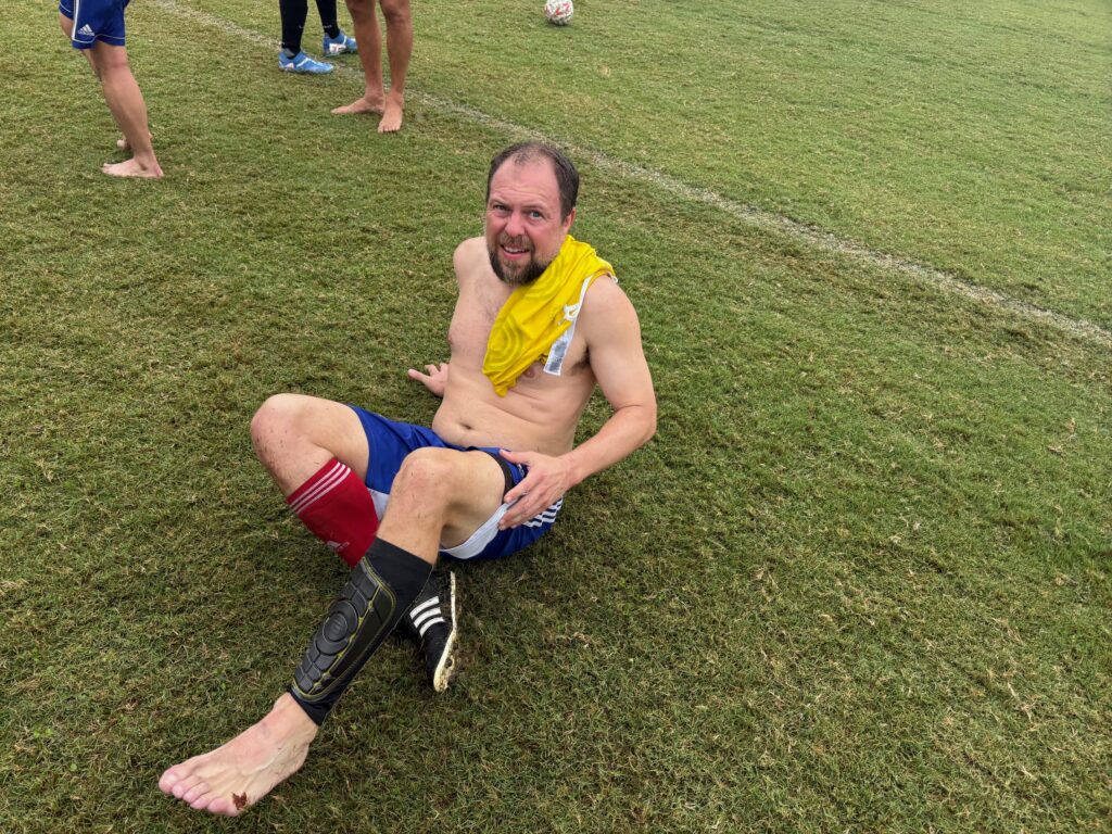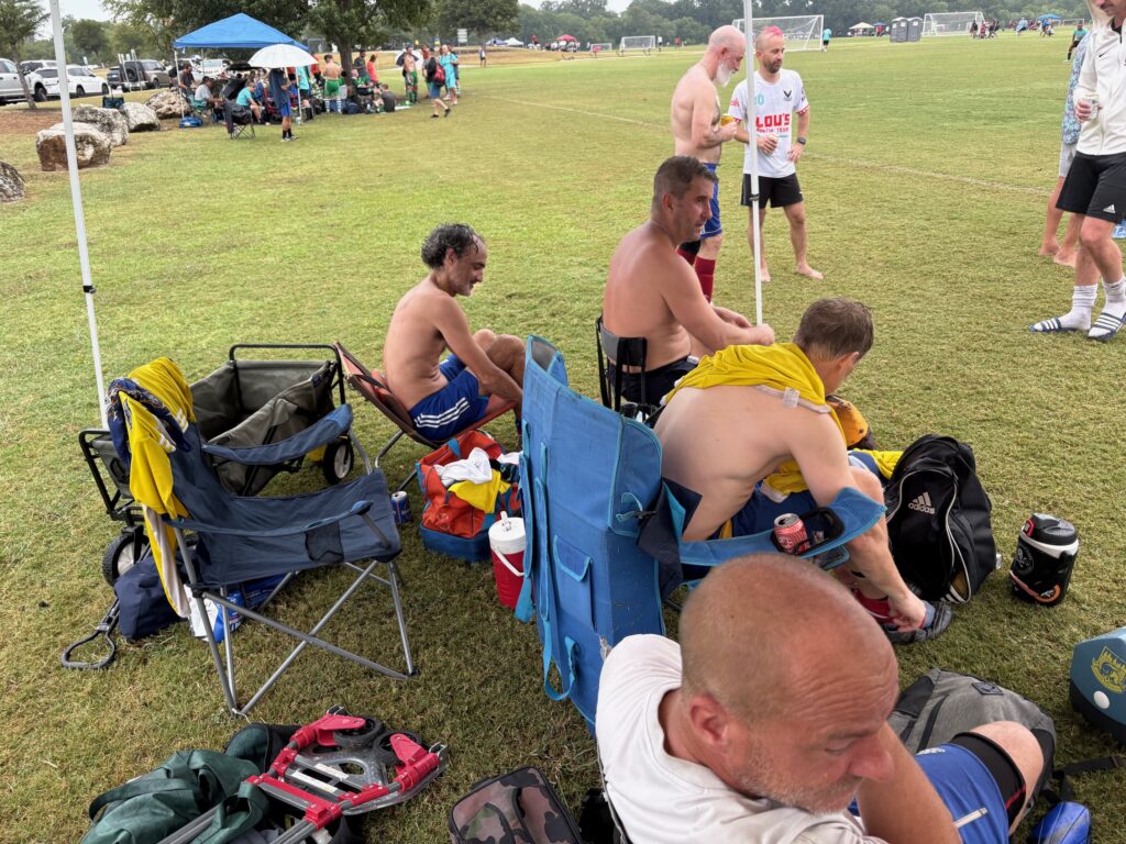 With only one sub available and 90% of the defense missing in action, it was time to get creative with the back line. Led by Chris G, Brian Parks joined Chappy and Andy on the flanks. In midfield, Chris Peterson was back from injury and was mostly on the wing with Ciro, Scrwarzy, Pete and Jake. Up top it was the usual dynamic duo. Jefe was nursing a sore hammy and manning the tent, although he failed to keep his Captain’s chair dry.