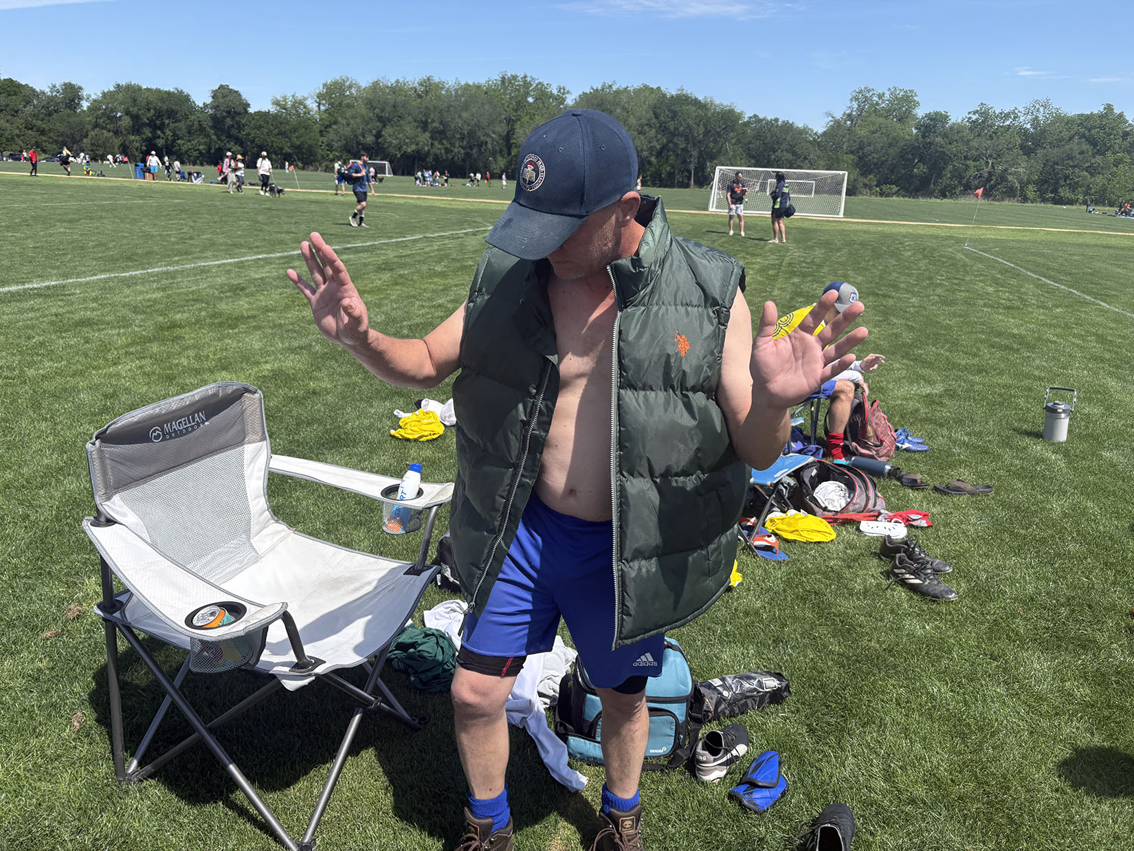After a flurry of weather-related late-night texts from The Thread featuring Troy Kimmel, Mark Muray, Quita Culpepper, Jim Spencer and Burton Fitzsimmons, the league decided to actually play a game after a brief Saturday night downpour. And what a glorious sight to behold greeted the Honey Badgers as Onion Creek had been transformed into a lush, magnificent green carpet of bunion-friendly soft grass. Perfect for gathering up errant over-40 passes.